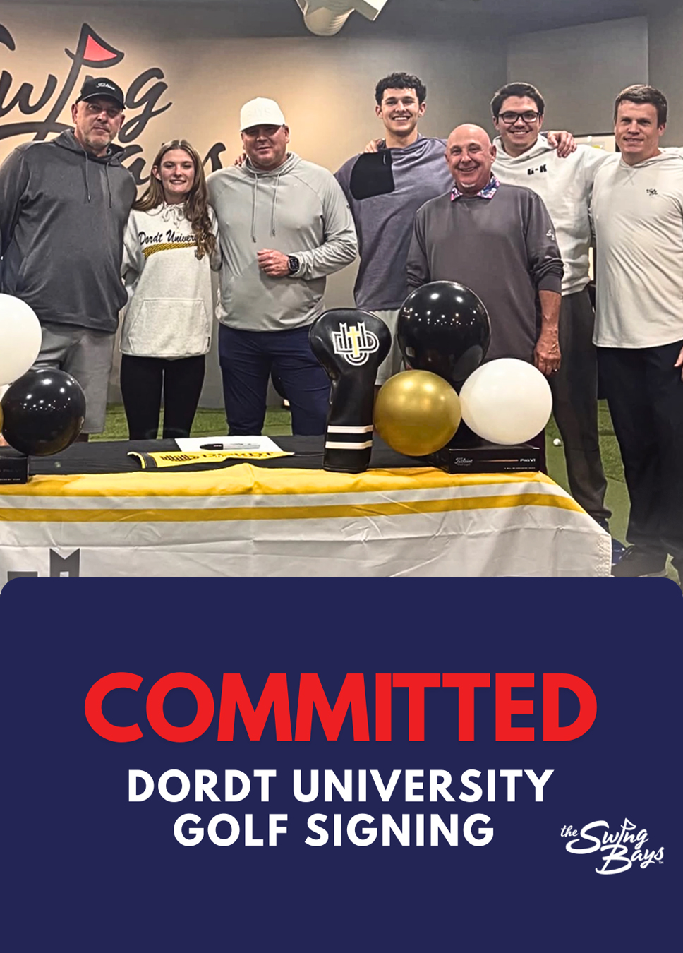 Olivia Meyers celebrates her commitment to Dordt University Golf surrounded by family, friends, and the Swing Bays team — where golf community and life’s biggest moments come together.